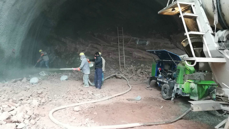 二、在料斗中加入比例為1:1的水泥和水的混合泥漿或直接加入清水,開始泵送,在加入正常混凝土料前,打開卸料口,將料斗內剩余的清水或泥漿放出,然后打開送風閥門,加入正常混凝土料,開始進行噴漿作業。
