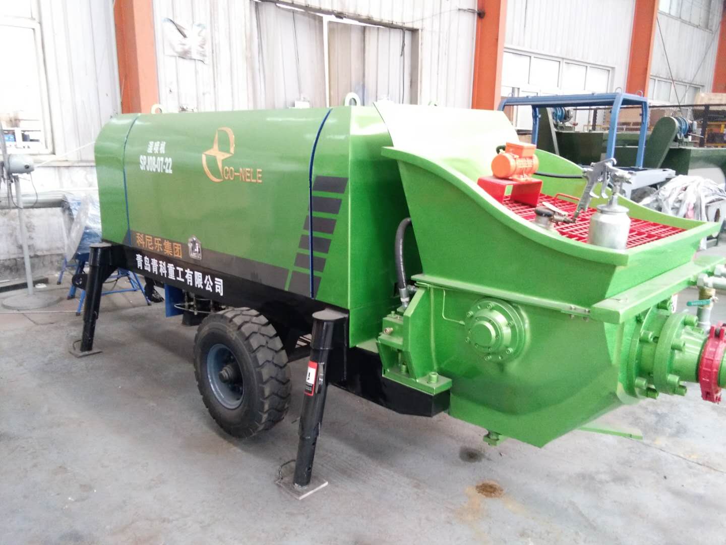 青島青科重工有限公司是集科研、生產、銷售及售后服務于一體的專業研制大型建設機械設備的企業。該公司的混凝土濕噴機具有以下技術特點:1.噴射量連續可調(無級變速)。2.速凝劑添加量連續可調。3.集中潤滑系統,有效延長了磨損件的使用壽命。4.產品輪式設計小巧靈活、移動方便、維護簡單5.原裝進口伊頓閥組和分體活塞。5.泵送壓力高,輸送噴射距離遠。6.高性能:噴層混凝土性能高,密實、均勻、高強度。7.速凝劑添加與控制技術:國內名牌計量泵計量準確,霧化射流與噴嘴物料混合使得速凝劑與混凝土混合均勻。8.降低了機旁和噴嘴外的粉塵濃度。消除了對工人健康的危害。9.回彈度低,干噴時,混凝土回彈度達15%-50%,采用濕噴技術,回彈率甚至可降低到10%以下,有效節約成本。